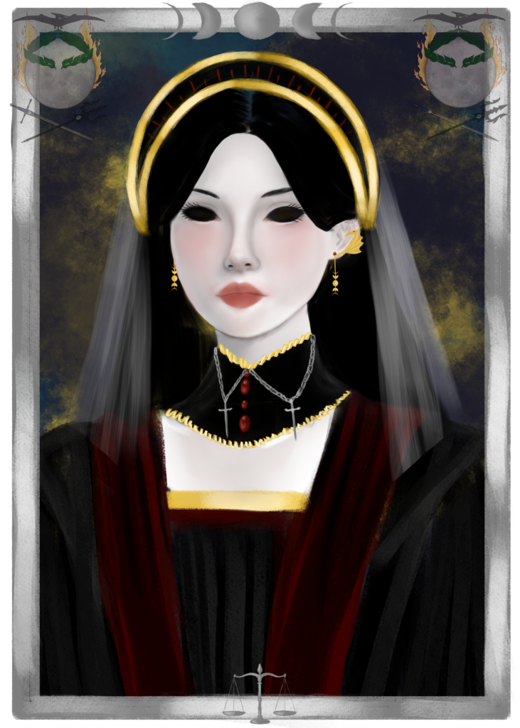 Avaras dresses with austere elegance, favoring the traditional Varkrys colors of deep reds, blacks, and imperial gold. Even as a child, she was adorned excessively, though hever by her own request. She is often depicted wearing the new moon crown with imperial white veil.