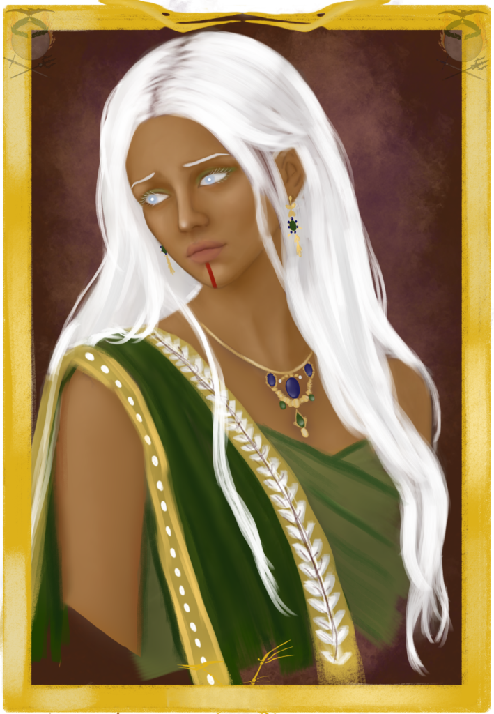 Lady Farelya Arhelunei was the first wife of King Sohan II Ardeyi of Phyrozes and now the wife of Lord Almazarros Aleran of Last Crypt. Shortly after the birth of her only surviving daughter, Mareya who died after three days — Farelya and Sohan’s marriage was annulled, as it became clear there would be no further heirs. The annulment was approved by Emperor Icairros Alzari. Soon after, Lord Almazarros Aldehar petitioned to marry Farelya, and the match was permitted, as custom encouraged nobles to remarry following an annulment to prevent crisis.