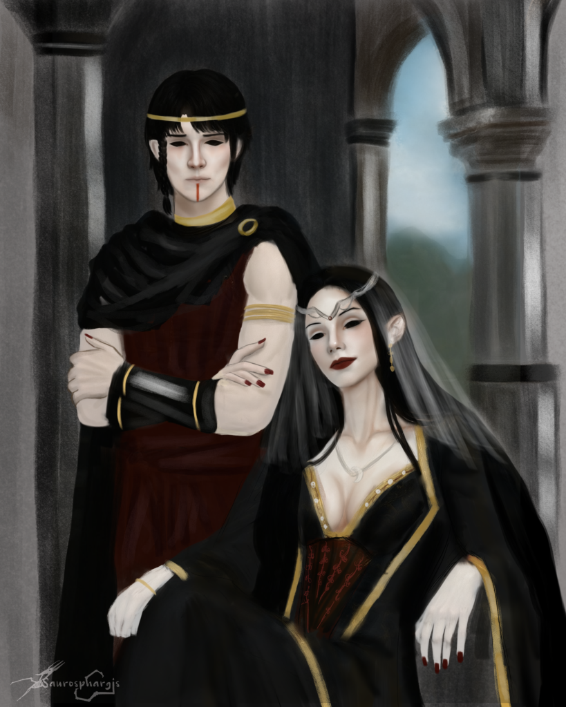 This changed when King Barros Alzari, the great-grandson of Zaerros, received envoys from the volcanic regions bordering the entryway of their caverns; the Sethri. Their envoys brought to Thospeiros gold, copper, silver, brass… bent to jewels and armors. They arrived with their fire wings, enamoring each and every man and woman in Barros’ court. They dressed richly in bent metals and they brought with them their queen, Hevaeth of Zi’fen. Hevaeth promised Barros the knowledge on how to bend metal to their will with fire… in exchange of Thospeiros’ underground gems. Barros was sold; he proposed a marriage between them in exchange of her fire and and his mined goods.