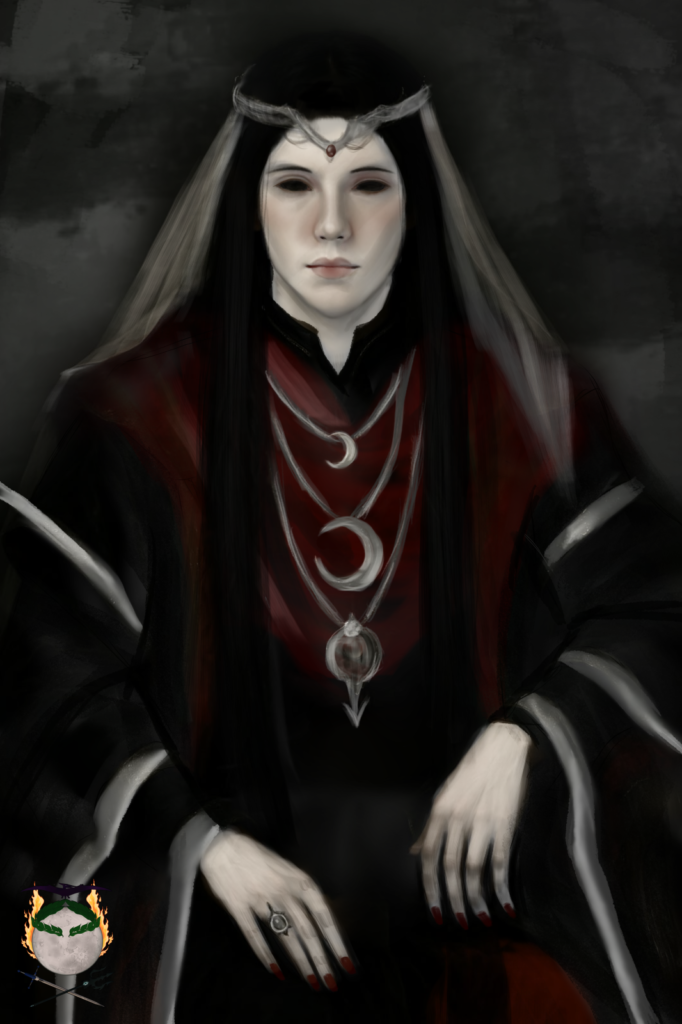The Varkrys prefer to dress in darker colors to blend with their surroundings. Materials such as spider silk and moss linen are often used by the Varkrys, and the Varkrys are known to wear long, flowy robes to protect their skin from the sun. Male Varkrys tend to not wear gold as gold is seen as the jewels of Mayathi and not Vaherdal’s. In turn, Varkrys ladies would only wear gold. The Varkrys’ symbols are moons, stars, and bugs.